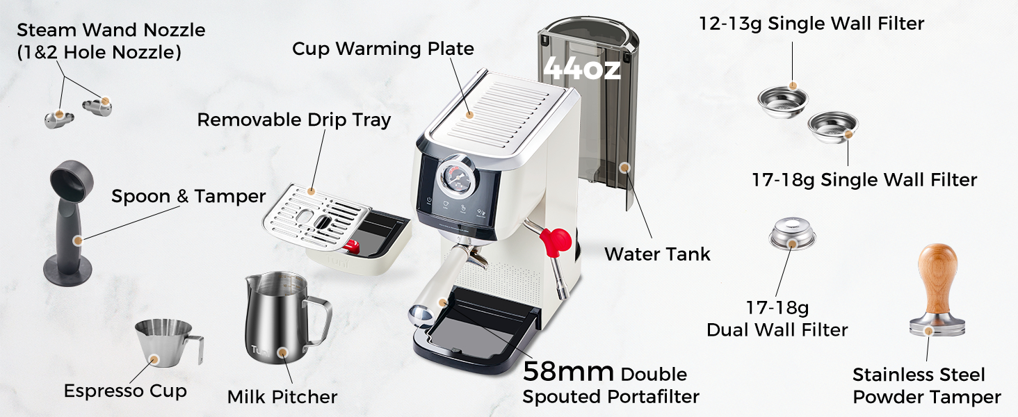- [Compact But Powerful] - The Tuni espresso maker features compact dimensions of 12.5"D x 5.7"W x 11.9"H, making it a perfect fit for any kitchen. Its sleek design blends seamlessly with your decor while saving valuable counter space. Despite its small size, the Tuni delivers powerful performance with 1750W of power, ensuring fast and smooth coffee brewing. This blend of compact design and high performance makes it an ideal choice for those seeking professional-quality espresso without compromising on space or style.
