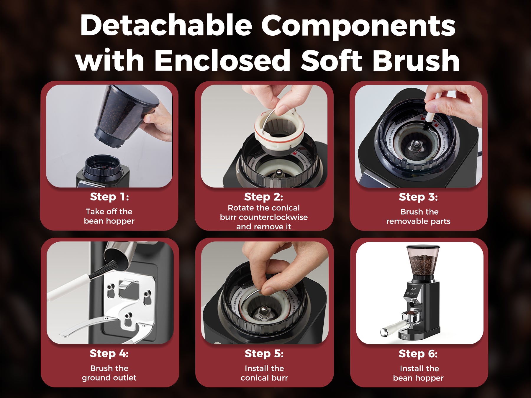 40MM CONICAL BURR: The TUNI espresso grinder is designed to minimize heat and preserve the delicate oils in coffee beans, ensuring a uniform grind and optimal flavor extraction. With its low 450rpm grinding speed, this coffee grinder reduces static and heat buildup, maintaining a stable grinding temperature for consistent, high-quality coffee every time. Ideal for coffee lovers, the TUNI coffee grinder delivers precision grinding and enhances your brewing experience.