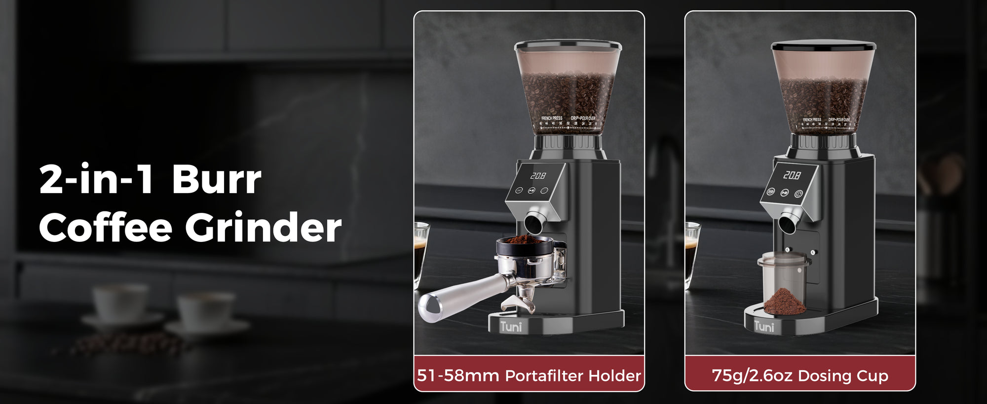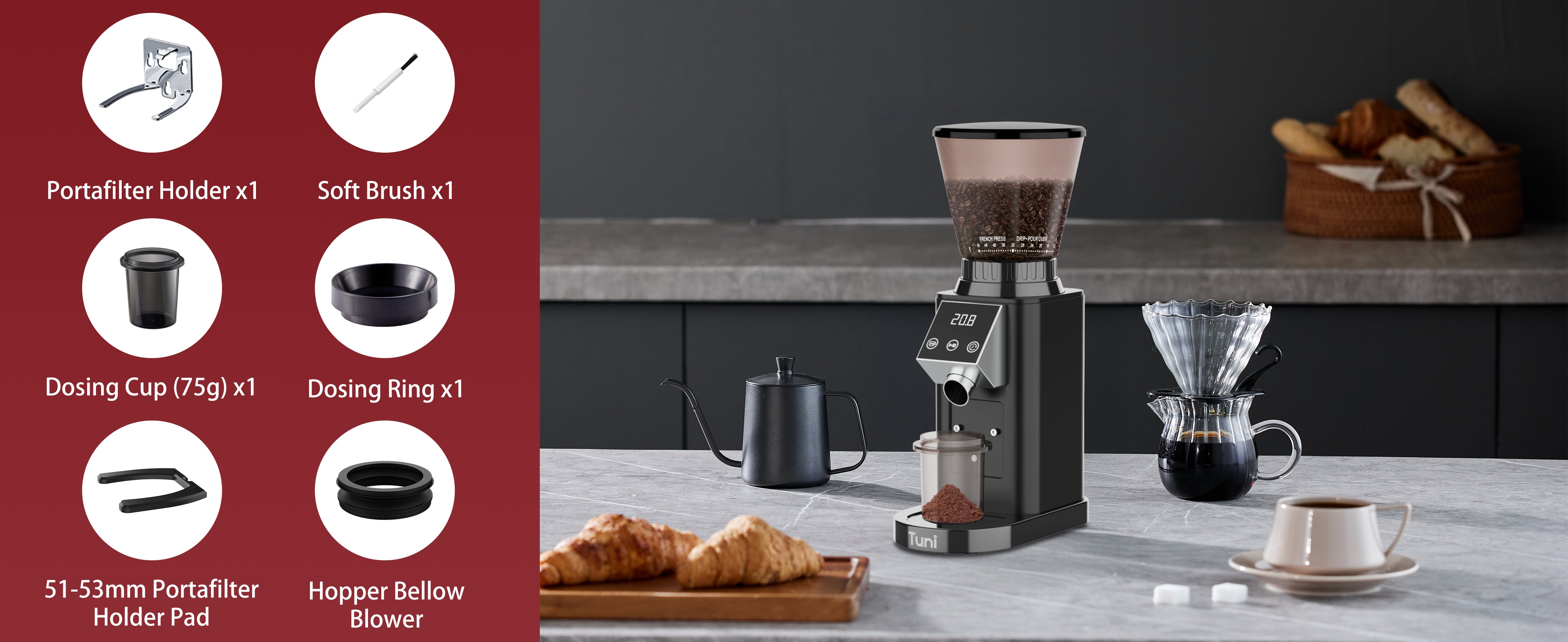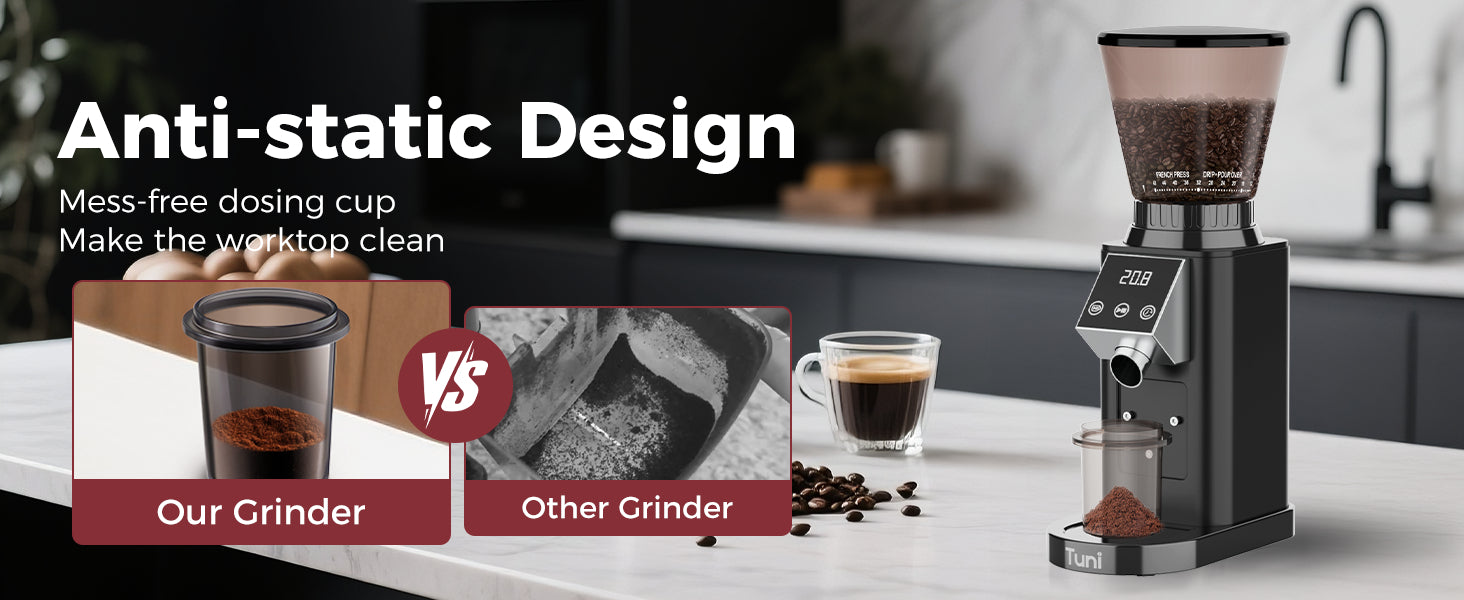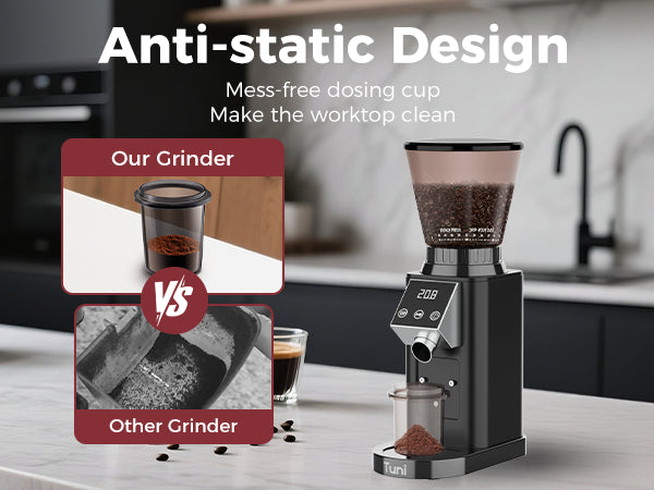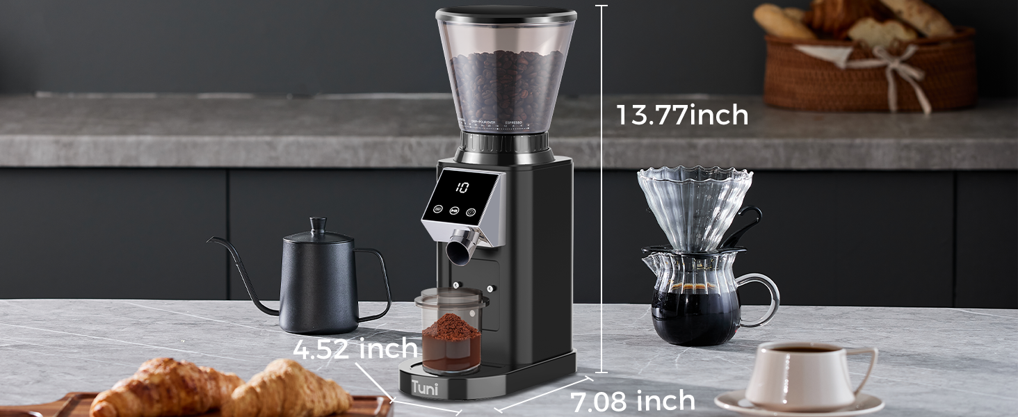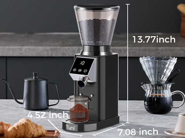 DIGITAL & TOUCH DISPLAY: The TUNI coffee grinder features an advanced LED control panel that clearly displays options and includes touch-sensitive switches for effortless operation and quick function switching. You can grind by cups, time, or choose between single or double espresso shots, all with the precision of an electronic timer. Plus, the grind time can be adjusted in 0.5-second increments, ensuring consistent and accurate dosing every time for a perfectly tailored coffee experience.