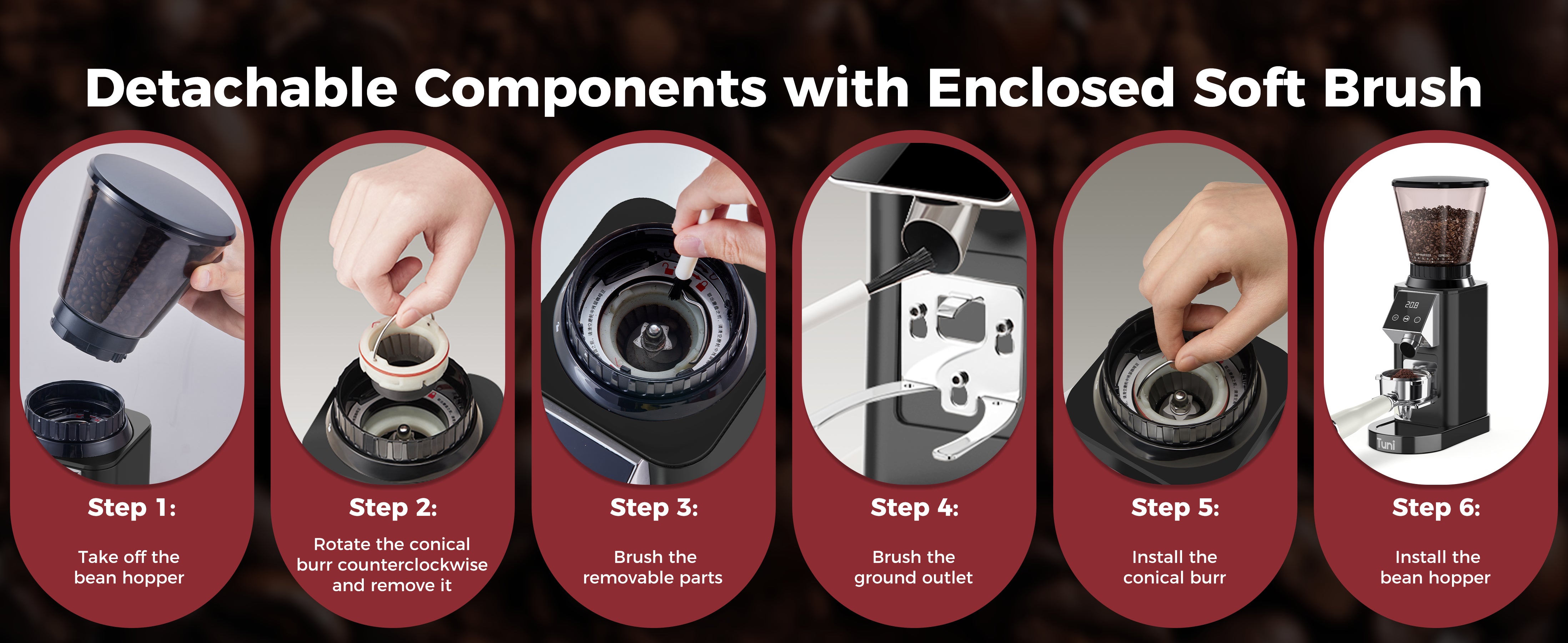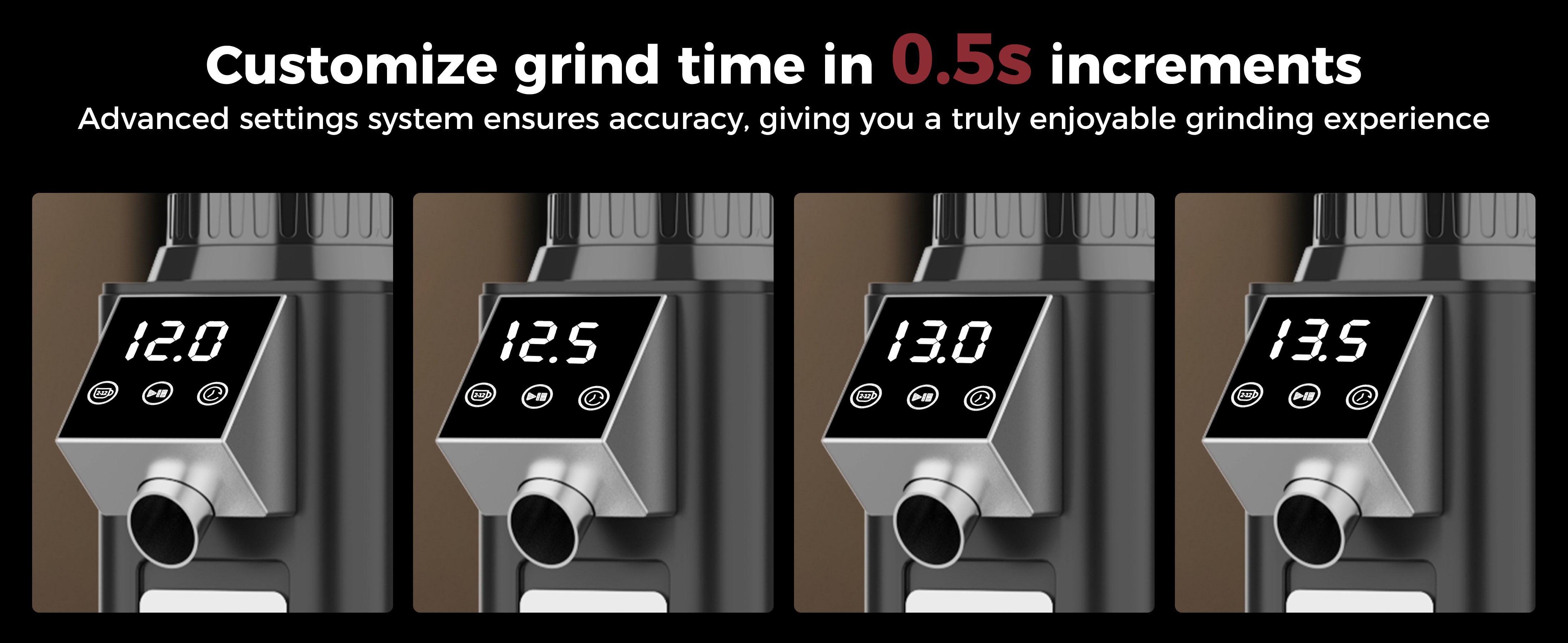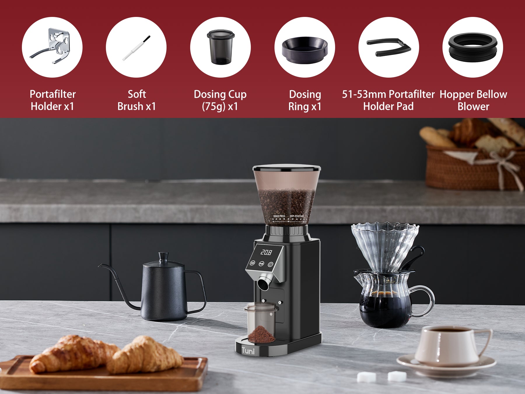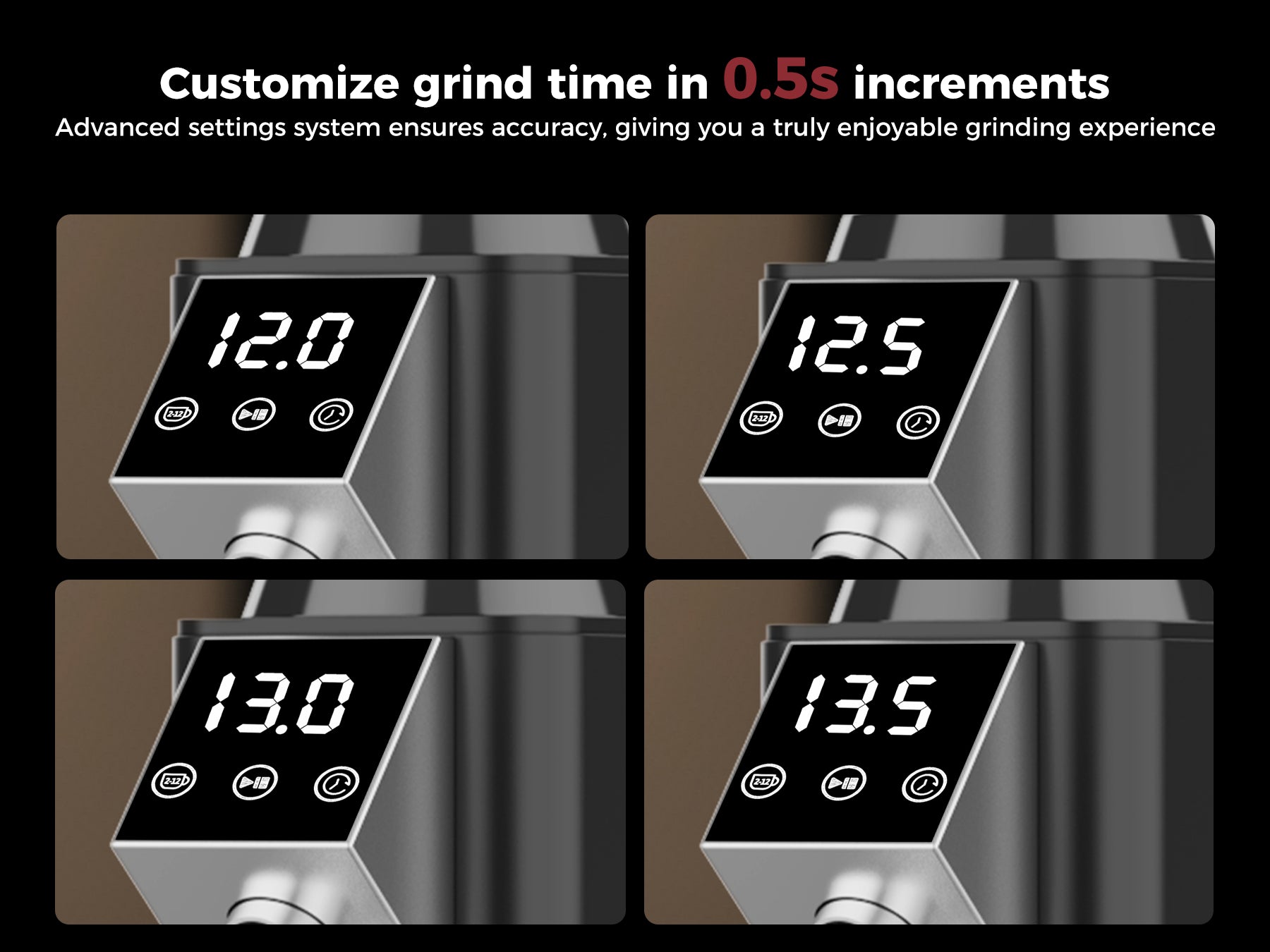 DIGITAL & TOUCH DISPLAY: The TUNI coffee grinder features an advanced LED control panel that clearly displays options and includes touch-sensitive switches for effortless operation and quick function switching. You can grind by cups, time, or choose between single or double espresso shots, all with the precision of an electronic timer. Plus, the grind time can be adjusted in 0.5-second increments, ensuring consistent and accurate dosing every time for a perfectly tailored coffee experience.
