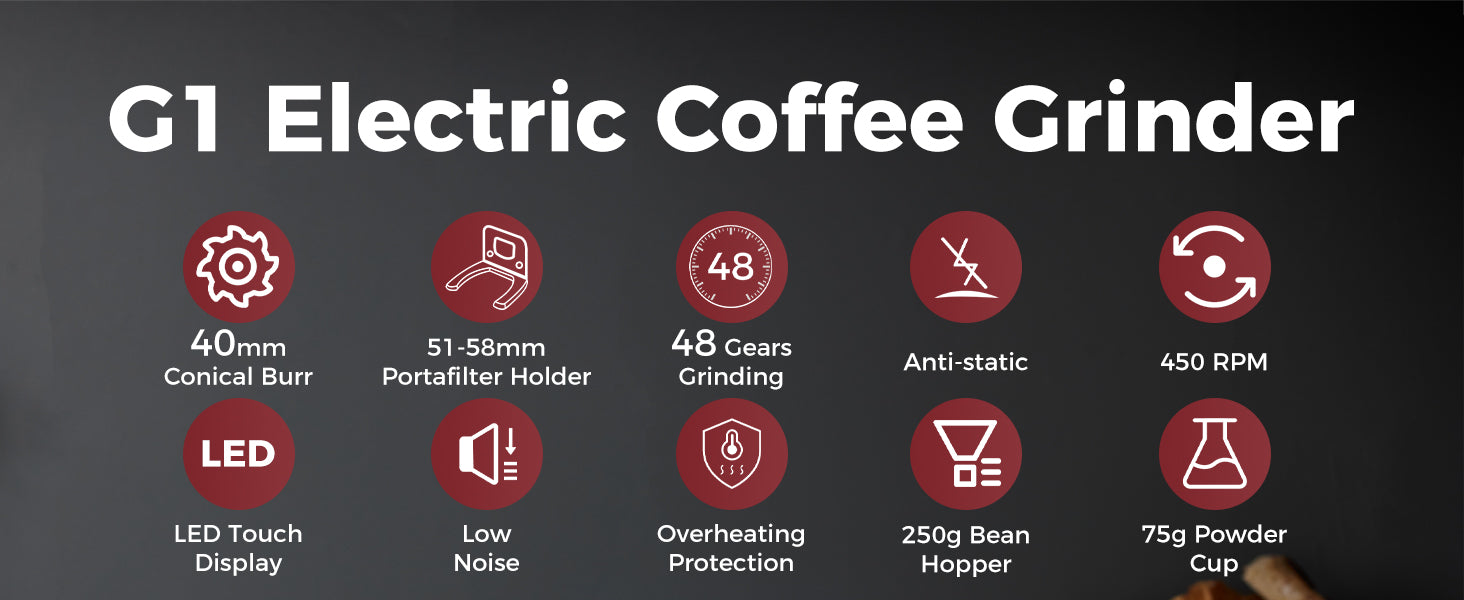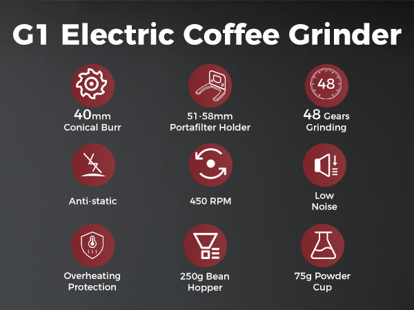 PACKAGE INCLUDED: G1 Noir conical burr grinder comes with portabfilter holder pad(suiatble for 51-53mm), 54-58mm portafilter holder, dosing cup, dosing ring, hopper bellow blower, soft blush. This complete grinder kit offers seamless adaptability, whether you’re a home barista or operating in a professional setting. Enjoy greater precision, easier maintenance.
