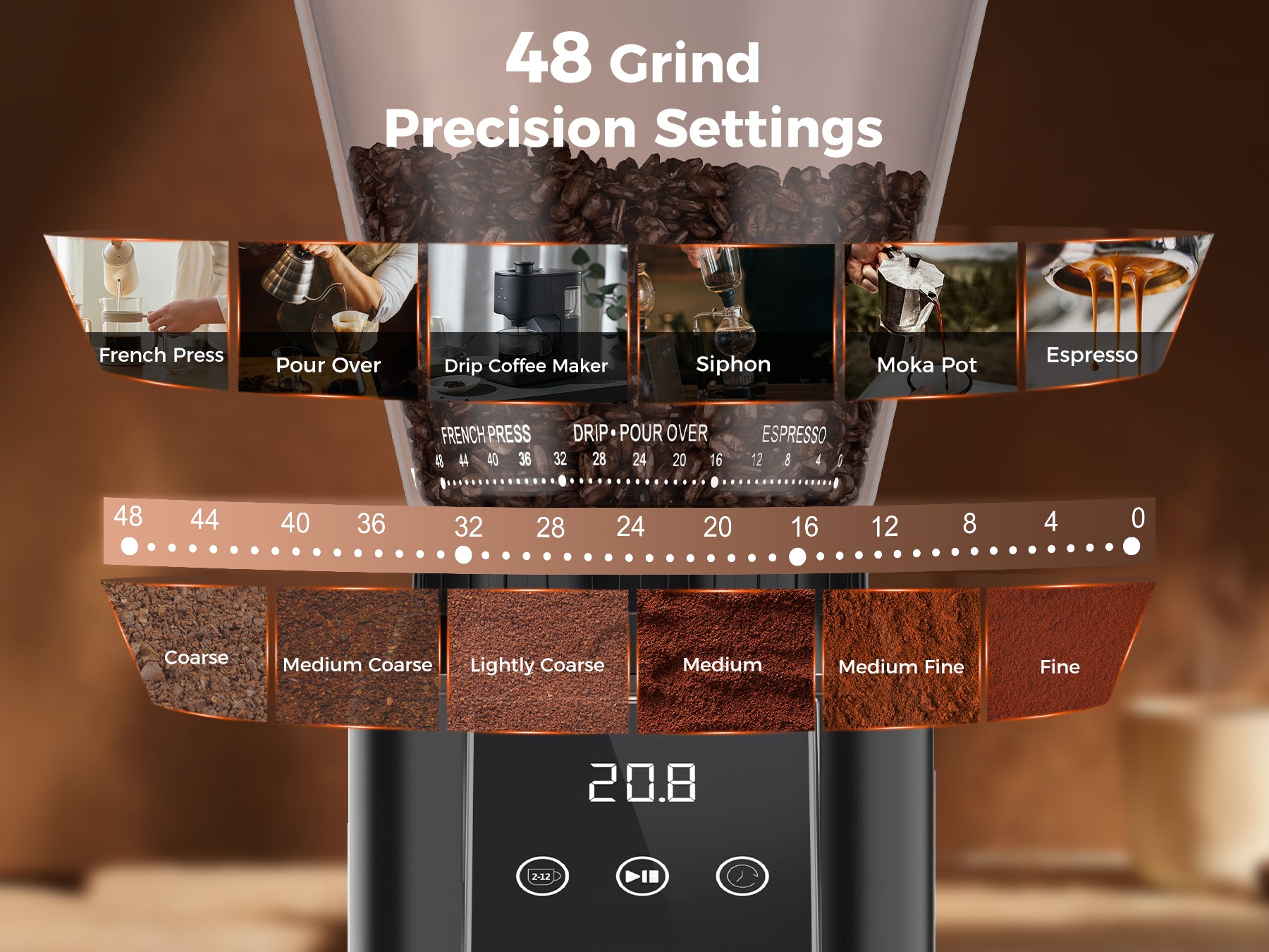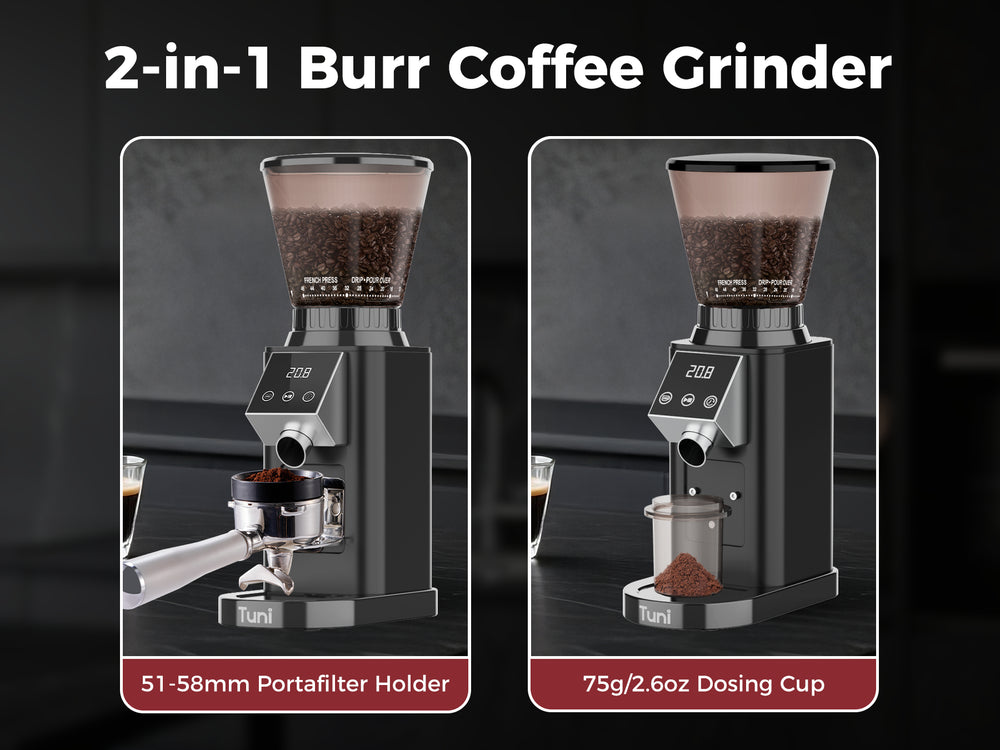 2-12 CUPS SELECTION: The TUNI coffee grinder features precision cup quantification and an electronic timer, allowing you to select from 2 to 12 cups for your brew. The Precision Electronic Timer lets you adjust grind time up to 60 seconds in 0.5s increments, ensuring a consistent and accurate dose every time. Perfect for coffee enthusiasts, this coffee grinder delivers precise, tailored grinds for a flawless cup of coffee, no matter your brewing method.