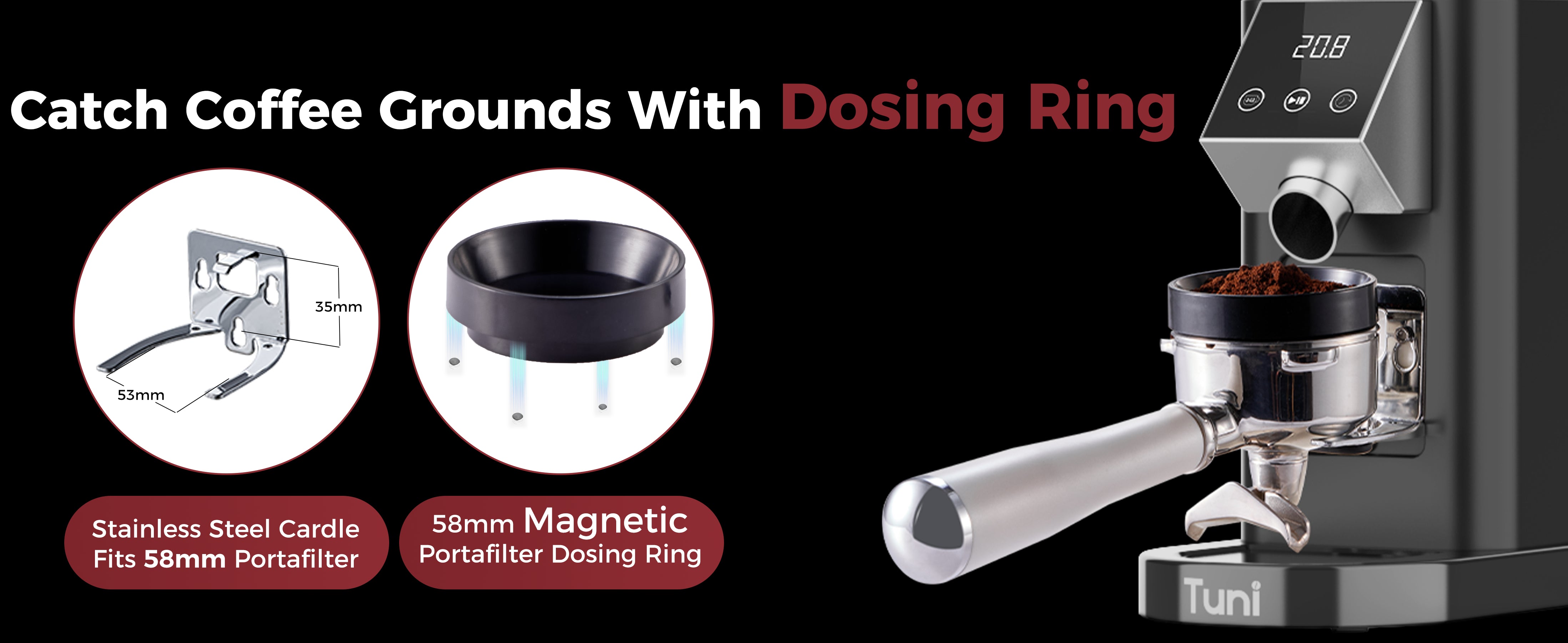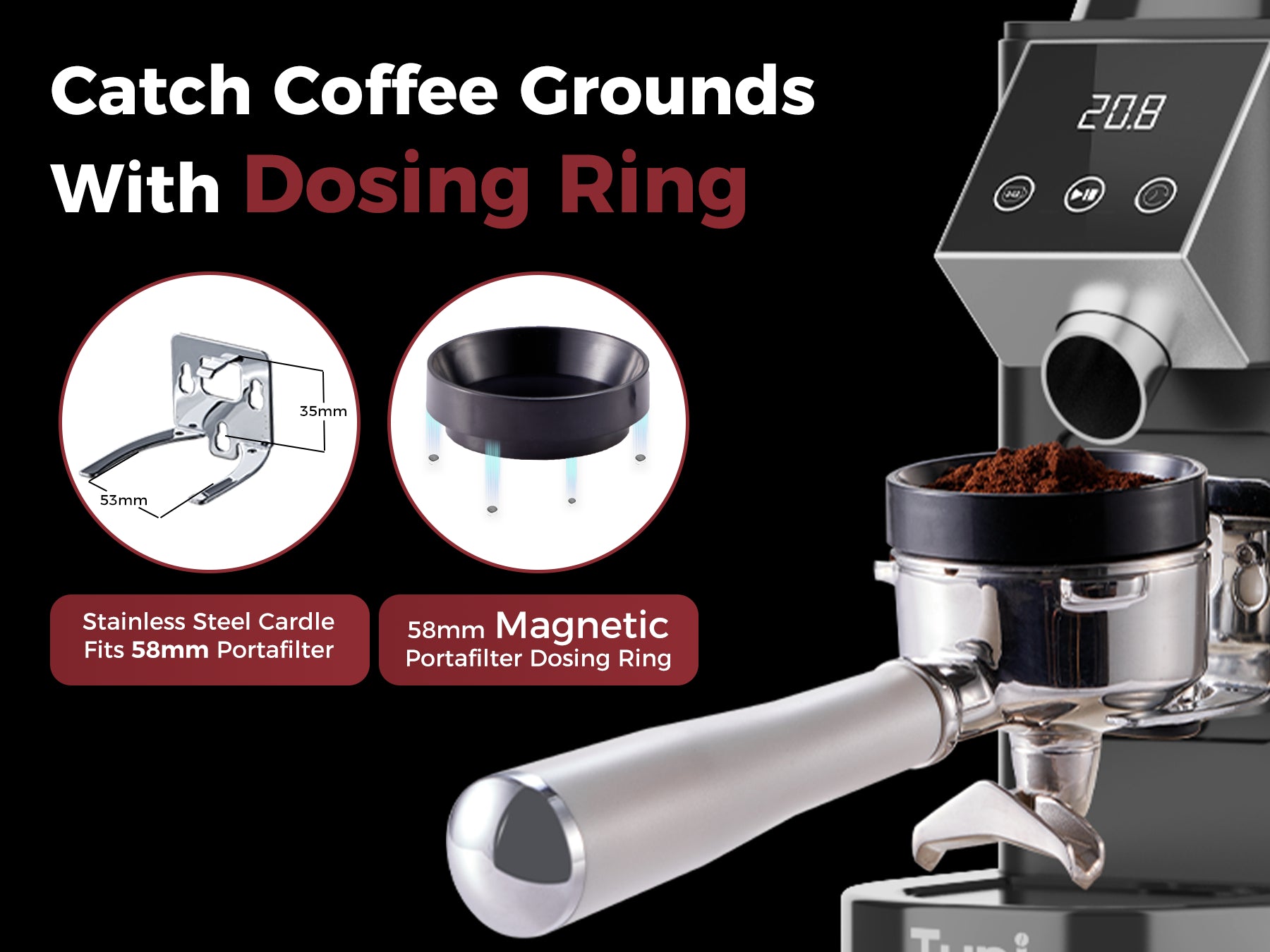 Included Components | 51-53mm portafilter holder pad, Portafilter Holder(compatible 54-58mm), Dosing cup, Dosing Ring, Soft Brush, hopper bellow blower |